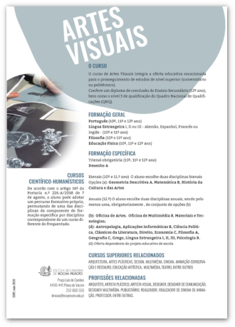 É a opção ideal para alunos com sensibilidade artística, criatividade e interesse em explorar novas formas de expressão. Constitui uma excelente base para o prosseguimento de estudos em áreas como Belas-Artes, Design, Arquitetura, Multimédia, Conservação e Restauro, Fotografia, Artes Performativas, entre outras.