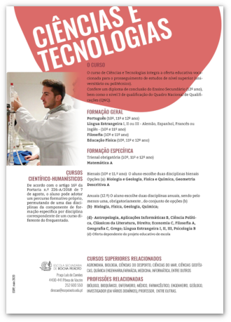 O Curso de Ciências e Tecnologias proporciona aos alunos uma preparação sólida nas áreas científicas fundamentais, como Matemática, Física, Química, Biologia e Tecnologias de Informação. Ao longo do percurso, os estudantes desenvolvem competências de análise, investigação, pensamento crítico e resolução de problemas, essenciais para compreender e responder aos desafios do mundo atual.