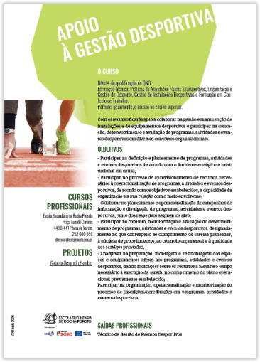 O Curso de Apoio à Gestão Desportiva prepara os alunos para atuar na organização, acompanhamento e dinamização de atividades e eventos desportivos. Ao longo da formação, desenvolvem competências em planeamento, gestão de instalações, apoio a equipas e promoção de estilos de vida saudáveis.