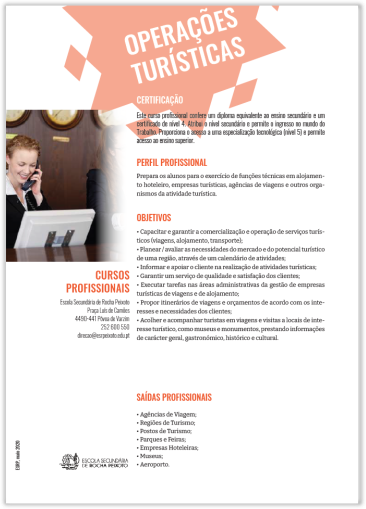 O Curso de Operações Turísticas prepara os alunos para desempenhar funções ligadas à organização, promoção e prestação de serviços no setor do turismo. Ao longo da formação, desenvolvem competências em atendimento ao cliente, gestão de reservas, informação turística, logística de viagens e operação de serviços turísticos.